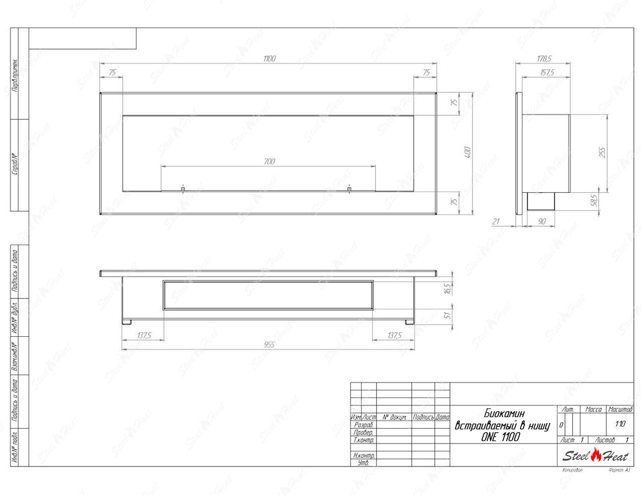 Встраиваемый Биокамин SteelHeat ONE-H 1100 предназначен для встраивания в глухие ниши из гипсокартона, кирпича, пеноблоков, бетона.